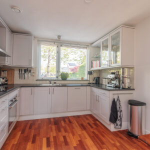 De gehele begane grond is voorzien van een stijlvolle parketvloer en een praktische trappenkast biedt extra bergruimte.