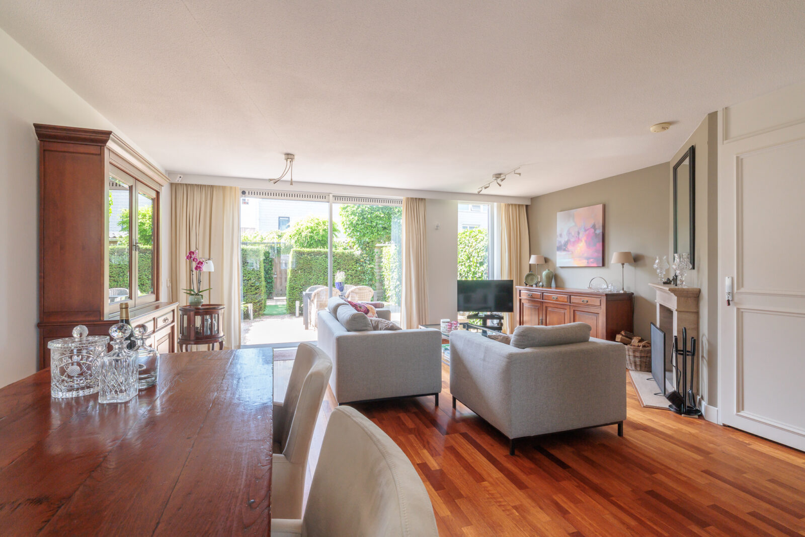 De royale en lichte woonkamer heeft een grote raampartij en schuifpui naar de tuin, en ook nog een extra zijraam. Dankzij het elektrisch zonnescherm geniet je hier het hele jaar van comfort. Een klassieke open haard zorgt voor extra sfeer op koude dagen.