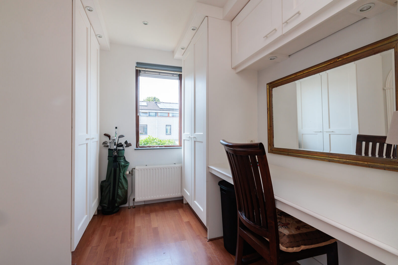 Vanuit de overloop is er toegang tot twee ruime slaapkamers, waarvan één is uitgebreid met een op maat gemaakte inloopkast met verlichting. Het is mogelijk om van deze kamer een derde slaapkamer te maken.